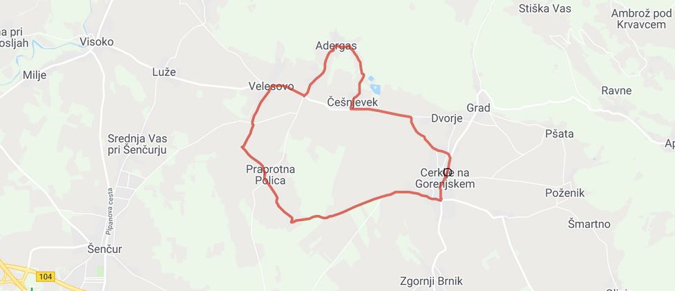 Iz Češnjeveka nadaljujemo pot skozi Trato do Velesovega, od tam pa nas makadamska pot med polji pripelje do Praprotne Police. Ko pridemo iz gozda pot zopet nadaljujemo med polji nazaj do Češnjevka, kjer smo turo tudi začeli.