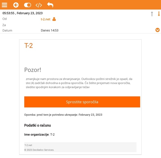 Uporabnike T-2 elektronske pošte obveščamo, da smo zaznali poskuse vdora v elektronsko pošto. Pozivamo vas, da se na tovrstna sporočila ne odzovete, ne klikajte na nobeno povezavo, ne vnašajte svojih podatkov, sporočilo pa nemudoma izbrišite. Prejeto elektronsko sporočilo ni uradno sporočilo naše družbe, ampak gre za očiten poskus zlorabe vašega zaupanja in lažno predstavljanje.