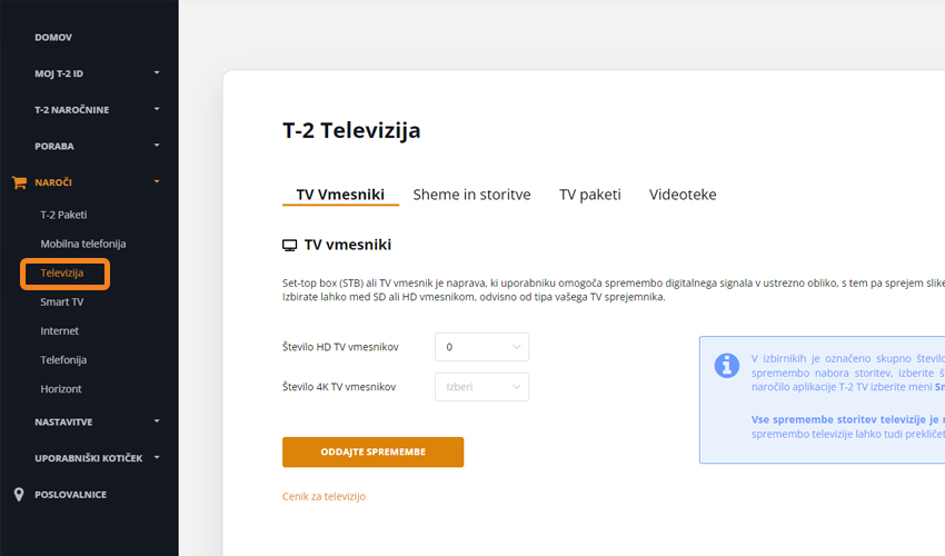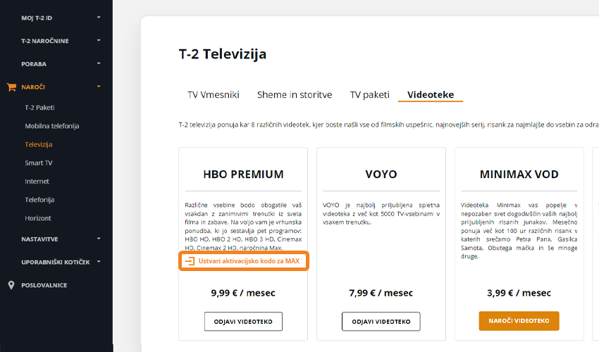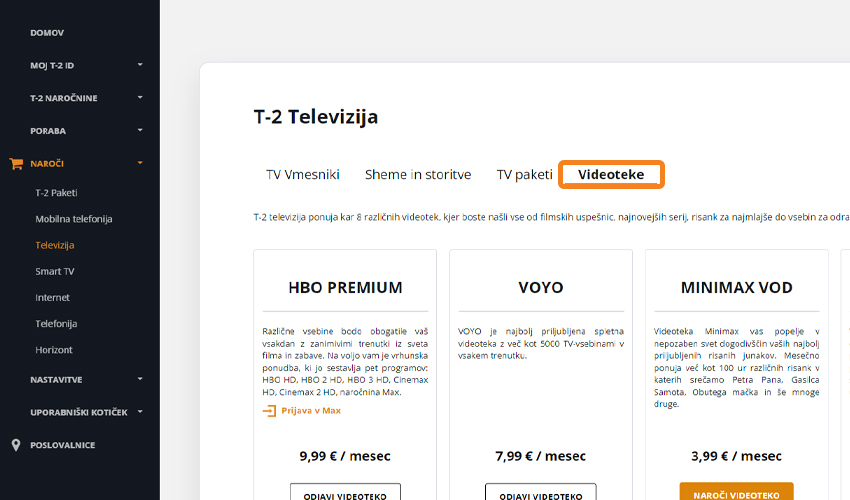 Z uporabniškim imenom in geslom se prijavite v portal Moj T-2. Po vpisu v kategoriji »Naroči« izberite »Televizija«.