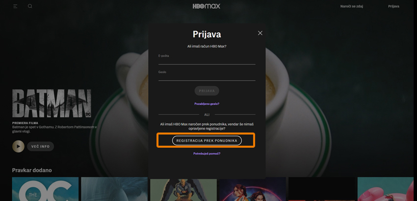 V kolikor ste že uporabnik HBO Max, aplikacijo HBO Max samo prenesete in vstopite s kontaktnimi podatki za HBO Max. V primeru, da ste svoje podatke pozabili, kliknite na Pozabljeno geslo in na kontaktni mail boste prejeli vstopne podatke.