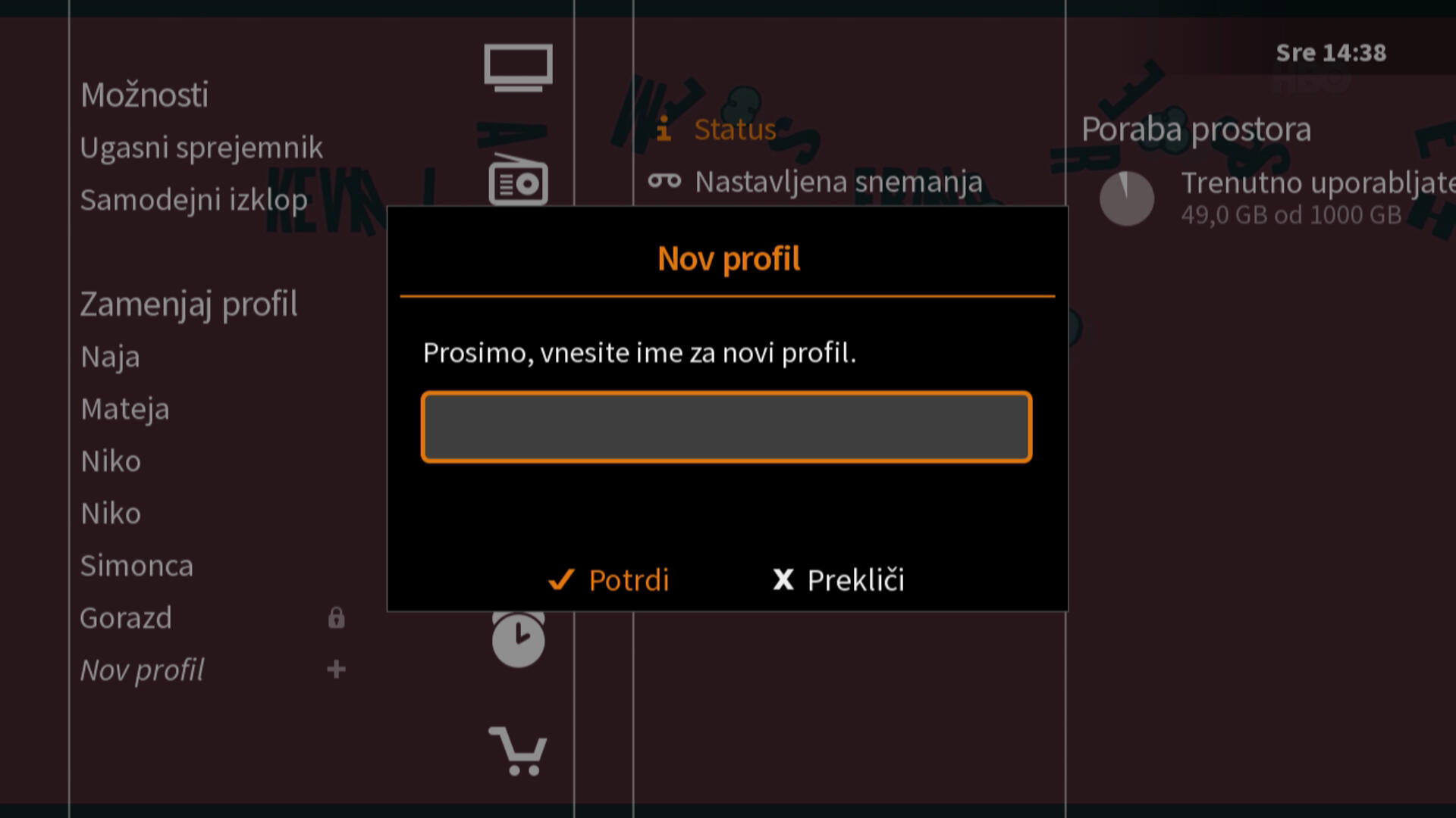 Izberete si ime in potrdite s tipko OK. Poimenujete ga lahko po osebi (Mojca, Romana, Uroš..), ali po izbiri žanra (filmski, risanke, za najmlajše …), lahko pa tudi po prostoru (dnevna soba, spalnica, kuhinja ..).