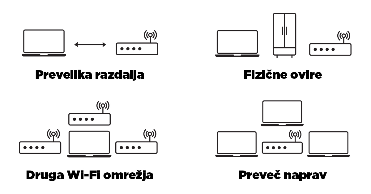 Vzroki za šibak ali nezanesljiv Wi-Fi signal so lahko: