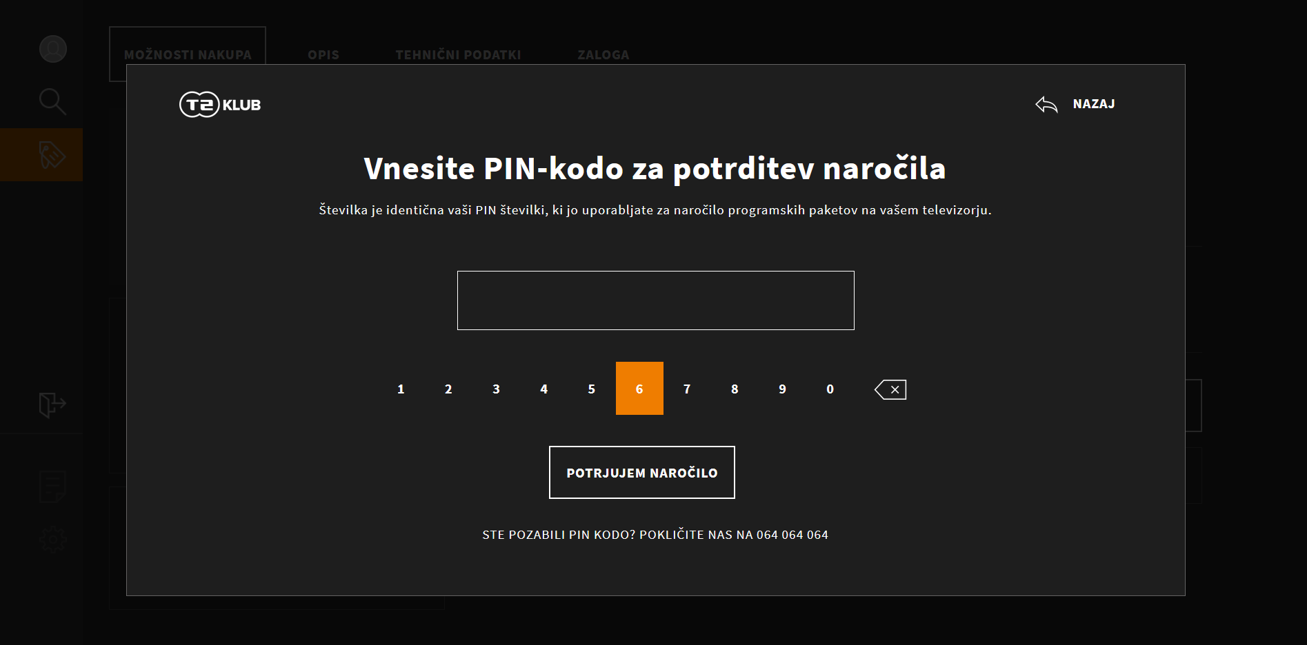 Postopek nakupa preko televizije je povsem preprost – s pomočjo daljinca izberete ustrezen izdelek ali storitev ter s PIN kodo potrdite nakup oziroma izbiro in način plačila, zatem pa lahko nadaljujete še s preostalimi nakupi. PIN koda za potrditev naročila je identična PIN, ki jo uporabljate pri naročilih TV paketov na TV vmesniku. V primeru, da ste pozabili svojo PIN kodo, jo lahko spremenite v portalu Moj T-2.