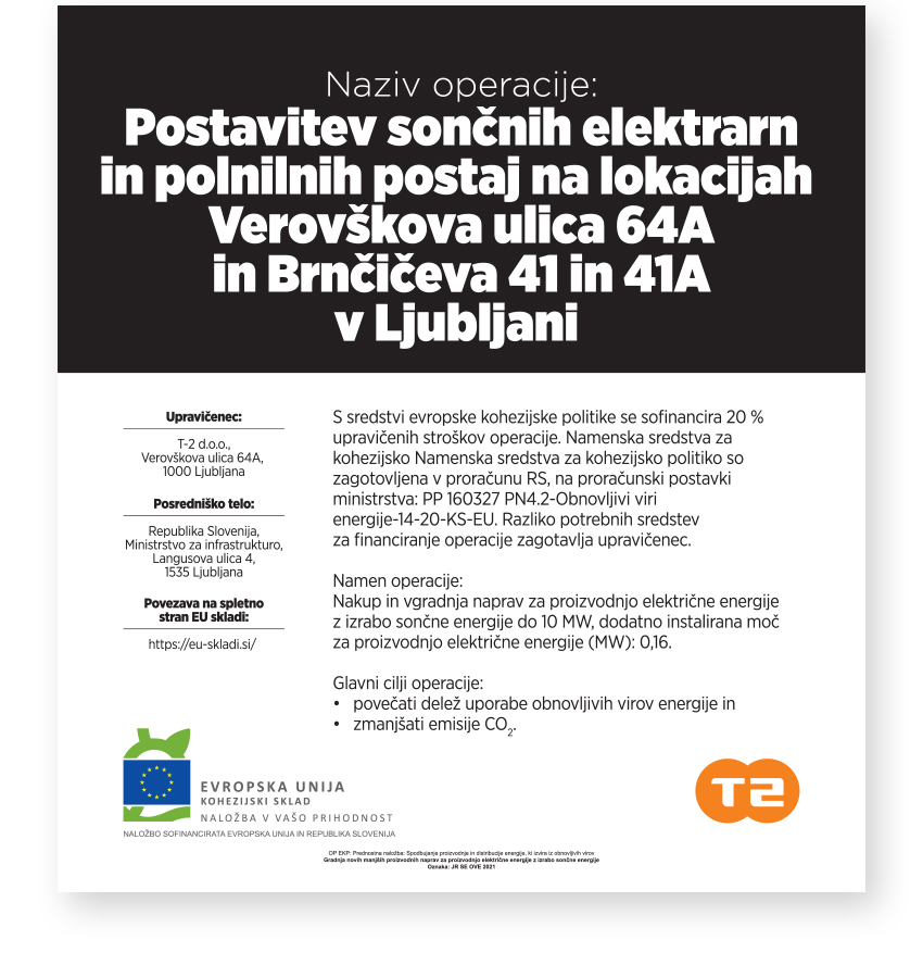 Naj vas ne skrbi, nismo sadili dreves na našo streho, za njih bomo poiskali primernejši prostor. Smo pa na strehah T-2 poslovnih stavb na Verovškovi in Brnčičevi ulici postavili sončni elektrarni ter polnilne lokacije. Premik k zeleni energiji je ena ključnih usmeritev na poti transformacije podjetja v trajnostno poslovanje. Prispevek k okolju, ki smo ga z uvedbo lastne sončne elektrarne ustvarili, pa je enak, kot da bi zasadili letno 786 dreves.