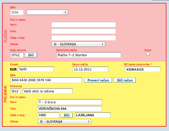 Za kodo namena lahko uporabite OTLC ali OTHR, za prvi del reference pa SI12. BIC banke prejemnika pa je odvisen od bančnega računa banke, kamor nakazujete sredstva. V nadaljevanju si lahko ogledate pravilno izpolnjen UPN obrazec za plačevanje naših storitev.