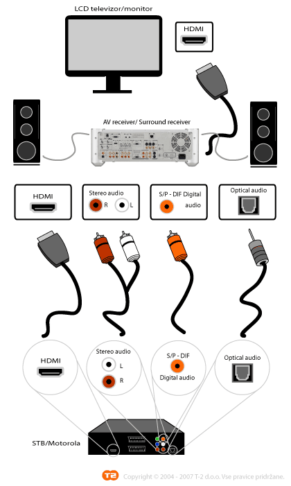Motorola 1910 dopušča priklop zvoka na stereo ali Surround sprejemnik prek HDMI IN, S/P-DIF digital audio (optično in koaksialno) ter navadnih stereo priključkov. Kabli niso priloženi.