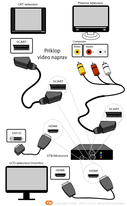 Na shemah so opisane monosti proklopa zunanjih naprav na TV vmesnik Motorola 1910. Ta TV vmesnik podpira televizijo standardne in visoke ločljivosti (HDTV).