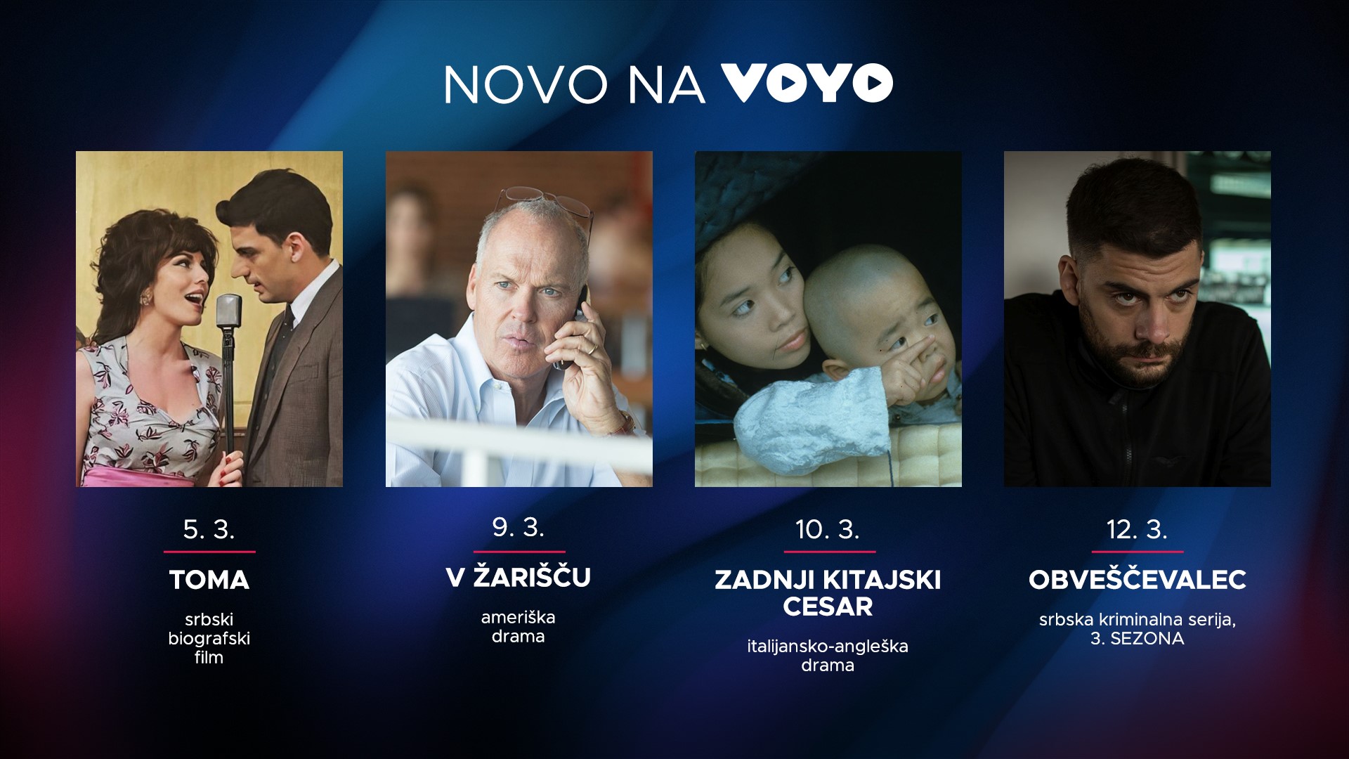 Toma: Biografska drama o življenju Tome Zdravkovića, zvezdnika nekdanje Jugoslavije, ki je lomil srca z melanholičnimi popevkami o neizpolnjenih ljubeznih in drugih “kafanskih” mukah. Zgodba spremlja njegovo življenje do vrhunca njegove priljubljenosti in težav, ki so ga pripeljale na rob propada. Film sledi dvema smernicama. Leta 1991 spremljamo odnos med Tomo in zdravnikom, ki ga začne zdraviti, in kako se to poznanstvo spremeni v prijateljstvo. Obenem pa spremljamo tudi Tomovo življenje od otroštva v Pečenjevcih, prek poznanstva s Silvano Armenulić, ki bo odločilno vplivalo na njegovo kariero. To je zgodba o duši. Srbski film bo na Voyo 5. marca;