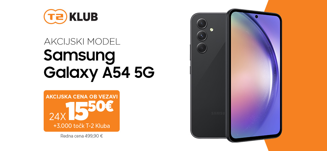 Novi Samsung Galaxy A54 je v juliju članom T-2 Kluba na voljo v akcijski ponudbi že za 24x 15,50 € + 3000 točk.