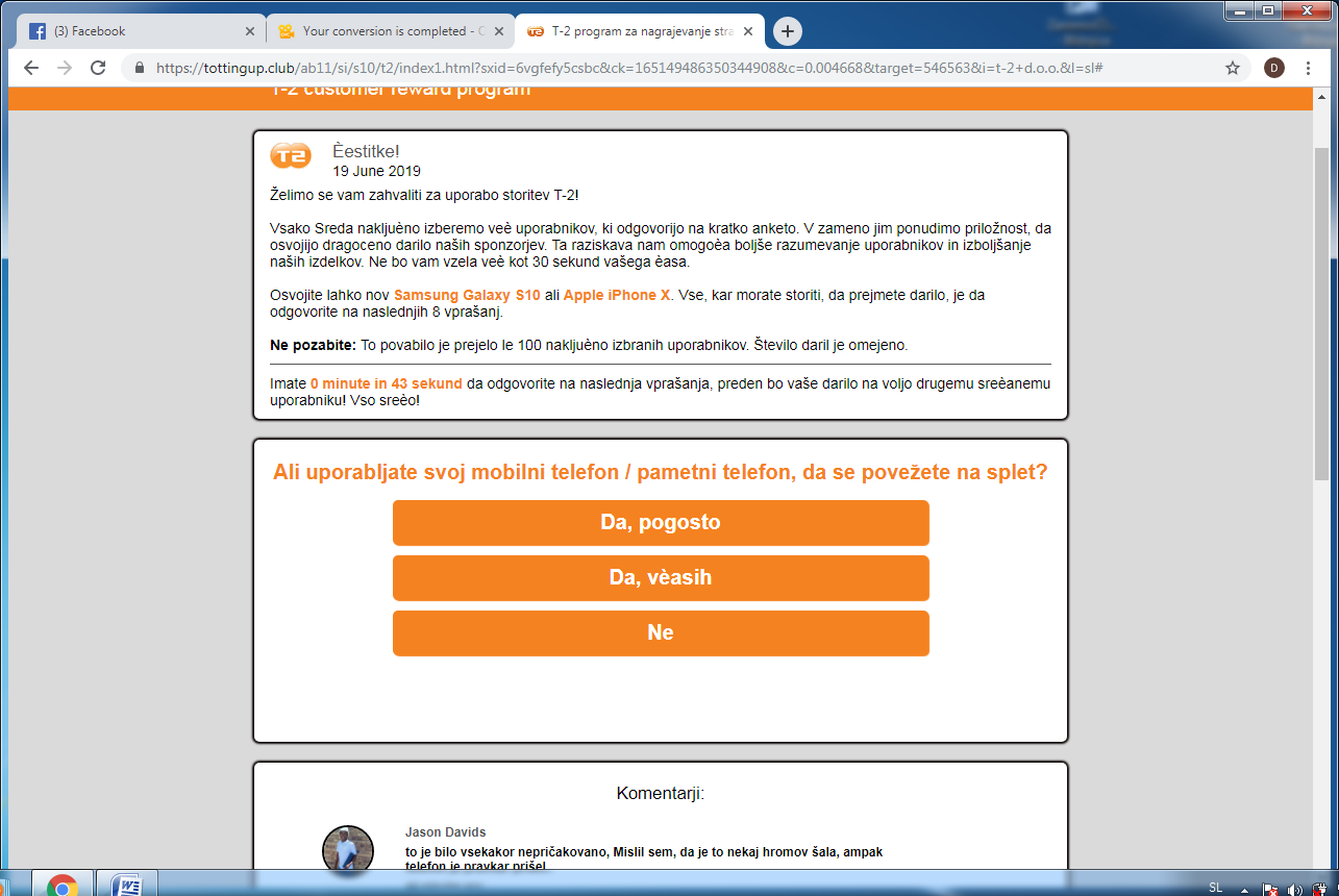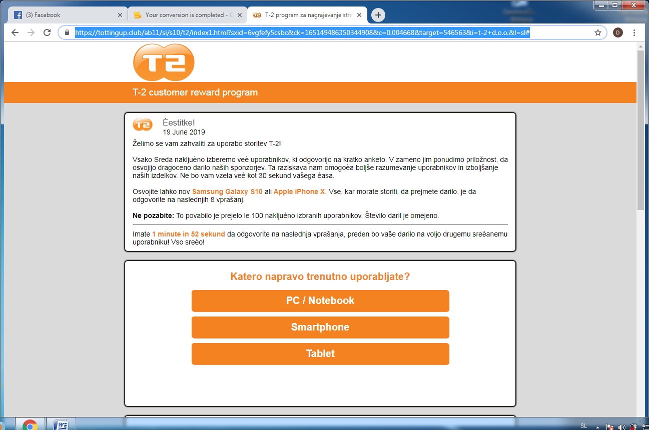 Na spletu kroži lažna nagradna igra T-2. V nobenem primeru ne izpolnjujte podatkov, saj bodo lahko uporabljeni za zle namene.