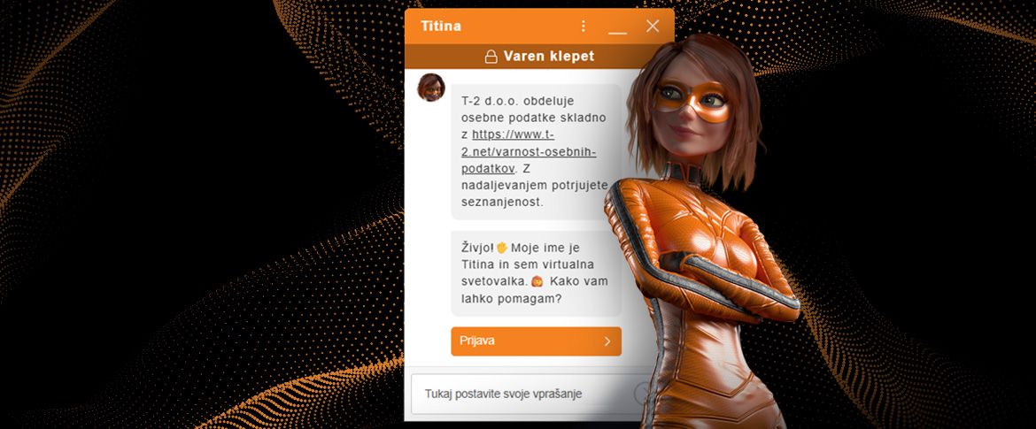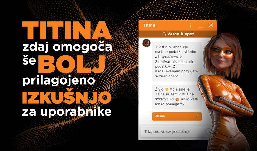 Titina je virtualna asistentka na naši spletni strani, odprete jo na t-2.net/titina ali prek ikone klepeta v spodnjem desnem kotu; tam se lahko tudi prijavite (SSO) in takoj dostopate do svojih naročniških podatkov.
