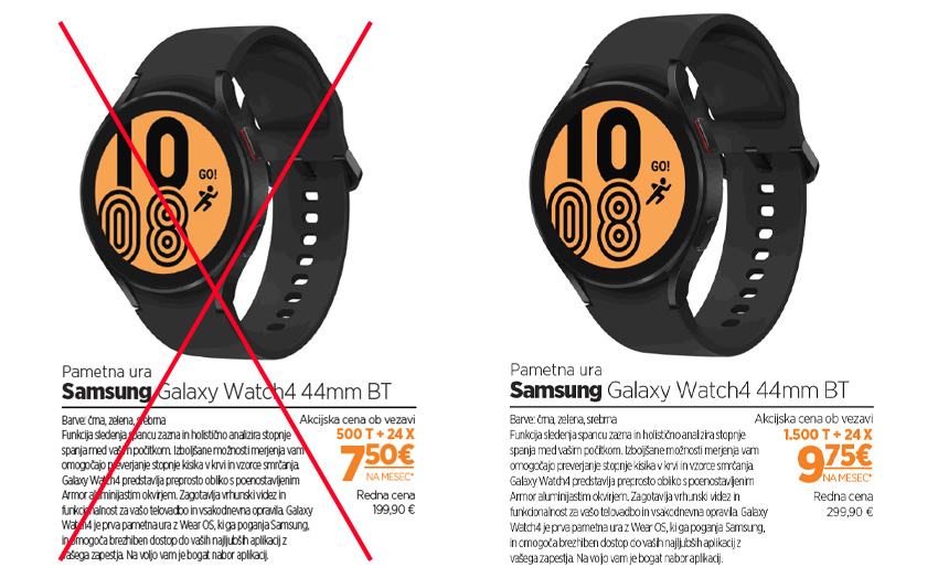Uporabnike obveščamo, da se bo cena pametne ure Samsung Galaxy Watch4 44mm BT, ki je oglaševana na avgustovskem računu, spremenila z 10. 8. 2022. Novi znesek mesečnega obroka ob naročilu na 24 obrokov in unovčenju 1500 točk bo 9,75 EUR na mesec (redna cena: 299,90 EUR z DDV).