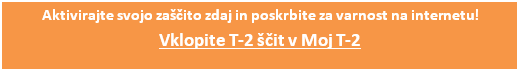 Namesto Panda paketov vam priporočamo izbiro storitve T-2 Ščit, ki nudi celovito zaščito vseh vaših naprav – tako mobilnih kot tistih, povezanih na domače omrežje. T-2 Ščit deluje v realnem času, samodejno zaznava nevarnosti, blokira zlonamerne strani in preprečuje krajo podatkov, vse brez dodatne programske opreme. Ob naročilu prejmete prvi mesec popolnoma brezplačno, poleg tega pa je do 31. januarja na voljo posebna akcija: 50 % popusta za dve leti zaščite.