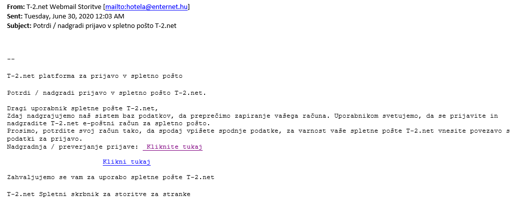 Naši varnostni sistemi so zaznali poskus lažne predstavitve in vdora v sistem (phishing), ki je prišel na vaš elektronski naslov. Prejeto elektronsko sporočilo, nikakor ni uradno sporočilo naše družbe, ampak gre za očiten poskus zlorabe vašega zaupanja. Pozivamo vas, da se tovrstnim sporočilom ne odzovete. Prosimo vas, da ste tudi v prihodnje pozorni, če bi bili deležni takšnih sporočil in nas o tem nemudoma obvestite na naš elektronski naslov abuse@t-2.net.