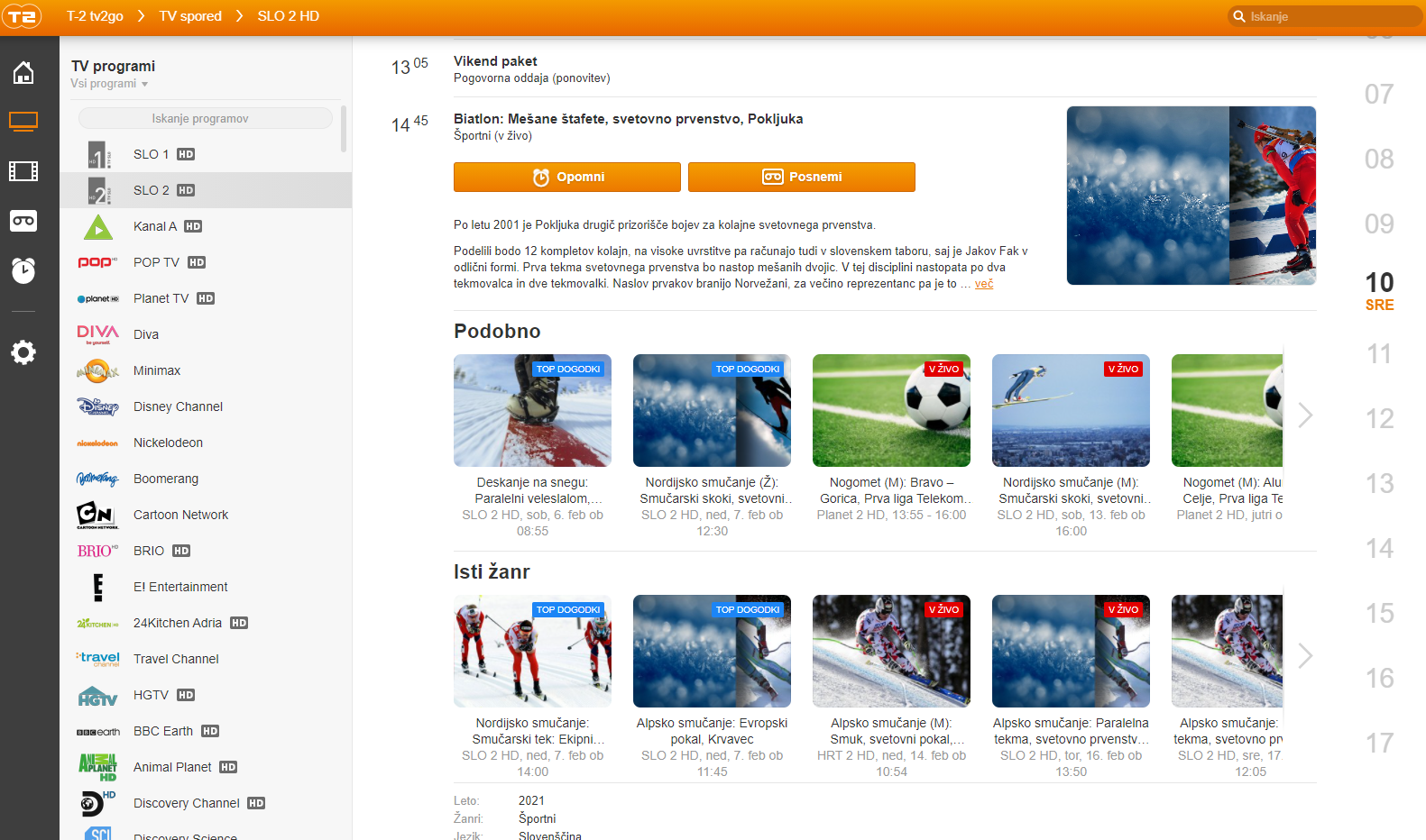 Uporabite snemalnik, s katerim lahko zajamete tako vse treninge, kot tudi tekme v moškem šprintu, štafete ali zasledovalno tekmo v ženski kategoriji. Vsebine pa si ogledate kadarkoli in tudi kjerkoli na aplikaciji tv2go.