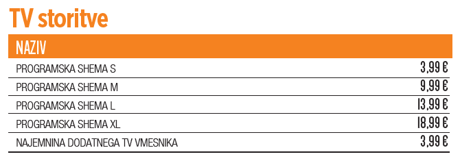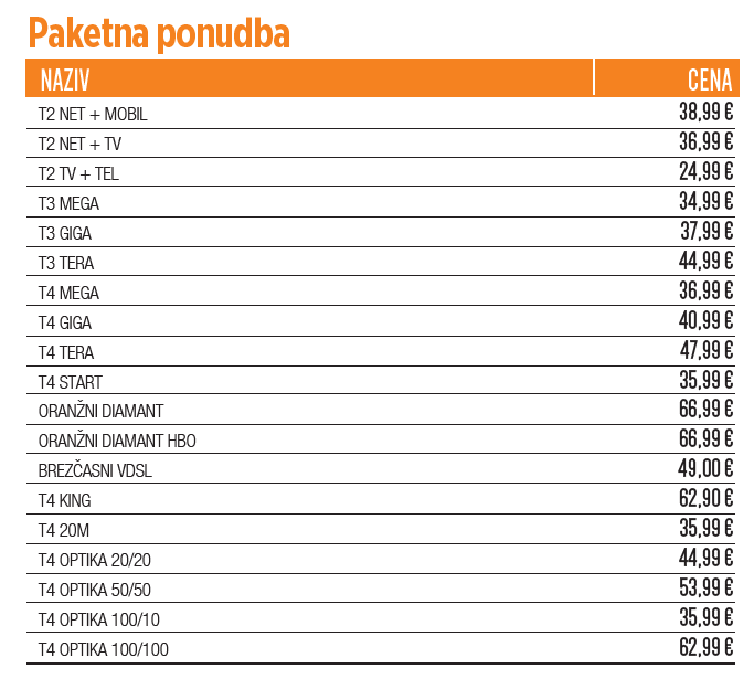 Nekateri izdajatelji najbolj gledanih televizijskih programov, med njimi POP TV, Kanal A, Kino, Oto, Brio, Planet TV in Sport Klub, so namrec napovedali znatno zvišanje cen svojih vsebin tudi v letošnjem letu. Stroški programskih pravic so se tako povecali do te mere, da v T-2 ne moremo prevzeti celotnega bremena stroškov nase, zato smo z mesecem marcem primorani prilagoditi cene paketov in TV shem. S 1. marcem 2018 bo tako v T-2 zacel veljati nov cenik TV programskih shem S, M, L in XL HD, ki vsebujejo od 60+ do 225+ programov, in bodo višje za 1 do 2 EUR. Zaradi prej omenjenih razlogov bodo za 1 EUR višje tudi cene tržnih paketov, ki ne vkljucujejo TV shem (T2 TV+TEL, T2 TV+NET, T2 NET+MOBIL, T3 MEGA, T3 GIGA, T3 TERA, T4 20M, T4 OPTIKA, T4 MEGA, T4 GIGA in T4 TERA). Mesecne narocnine tržnih paketov, ki vkljucuje TV sheme (Oranžni diamant, Oranžni diamant HBO, T4 King, T4 Start in Brezcasni VDSL), bodo višje za 2 EUR. Hkrati pa krepimo enega od bolj priljubljenih paketov, T4 Start, ki bo odslej namesto osnovnega mobilnega paketa XS brez vkljucenih klicev, SMS ali prenosa podatkov, vkljuceval mobilni paket Brezcasni Mini. Uporabniki paketa T4 Start bodo tako lahko brezskrbno klepetali po telefonu, pošiljali sporocila ter tudi brskali po internetu, saj bodo po novem v ceno paketa imeli že vkljucenih 200 minut klicev v vsa slovenska omrežja, 200 SMS ali MMS sporocil in 200 MB podatkovnega prenosa na mesec.