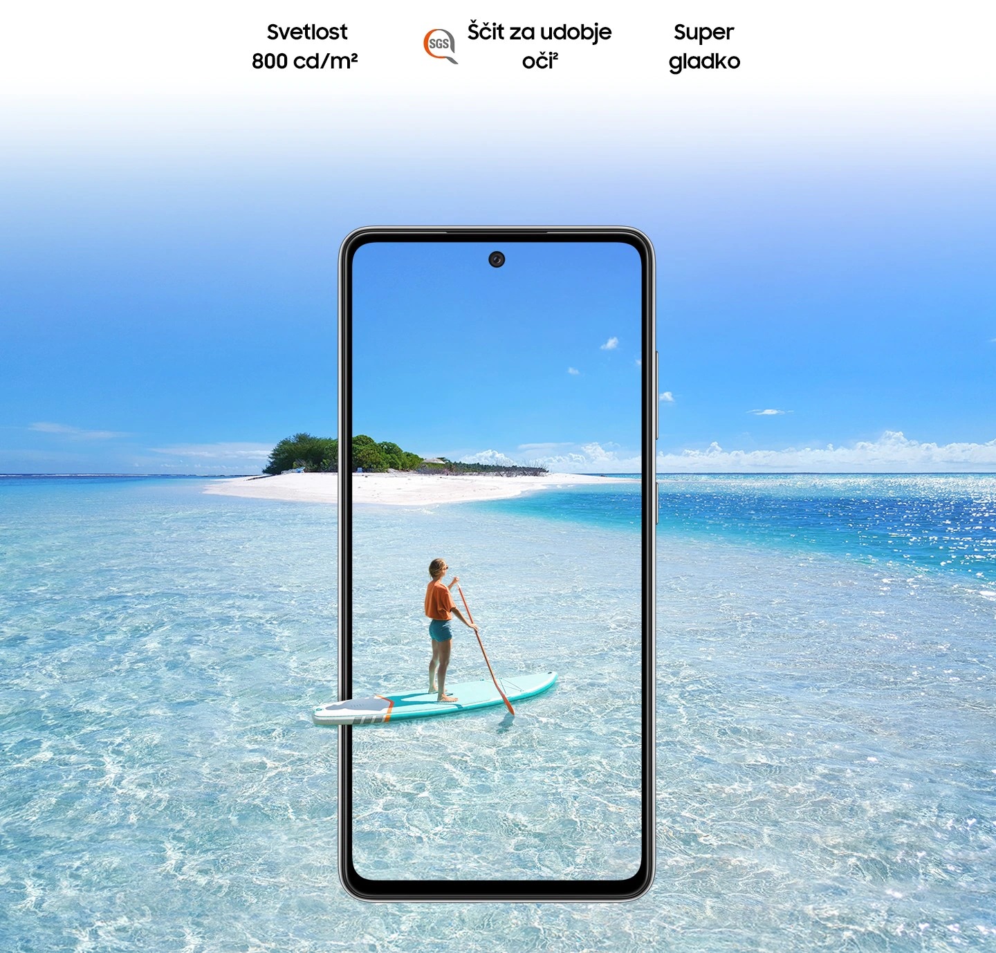 Napasite si oči na živahnih podrobnostih s FHD+ Super AMOLED zaslonom, z jasno sliko tudi ob močnejši dnevni svetlobi. Zaščita za udobje oči znižuje modro svetlobo, s funkcijo Super tekoče pa je pogled tekoč, ne glede na to ali igrate igre ali brskate. Vse to na razsežnem 16,5 cm (6,5'‘) brezkončnem O-zaslonu.