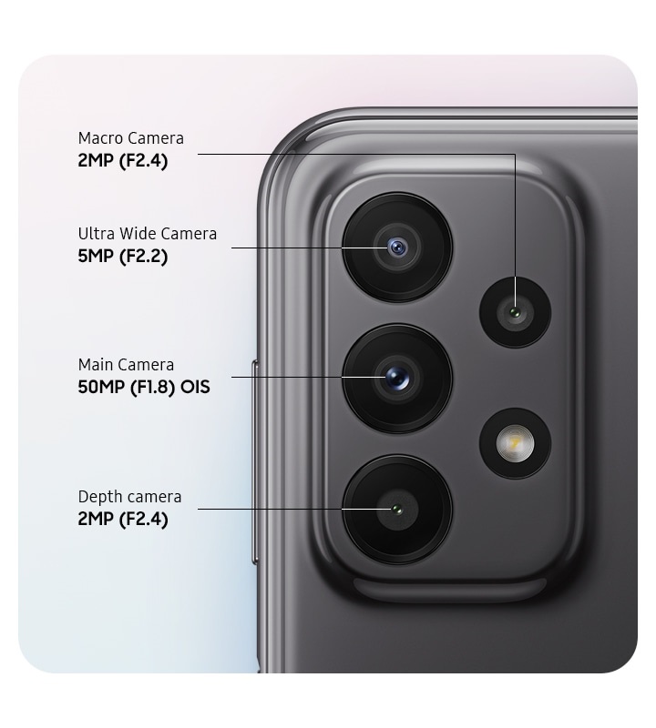 Galaxy A23 5G snema video posnetke bolj tekoče in ujame najmanjše podrobnosti tudi pri slabi svetlobi. Ujemite razločnejše in jasnejše posnetke s 50-MP OIS kamero, razširite svoj kot gledanja z ultraširokokotno kamero, prilagodite fokus z globinsko kamero in se približajte podrobnostim z makro kamero. 5 MP ultraširokokotna kamera s 123-stopinjskim pogledom vidi svet podobno kot človeško oko in tako omogoča fotografiranje z boljšo perspektivo. Globinska kamera 2 MP vam omogoča prilagoditev globine polja vaših fotografij. Prilagodite zameglitev ozadja za visokokakovostne fotografije portreta, s katerimi bo vaš motiv resnično izstopal.