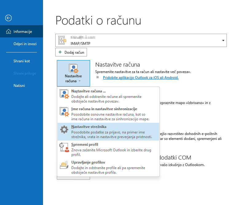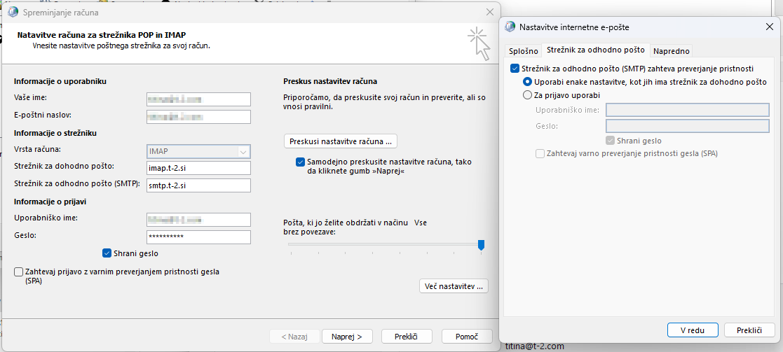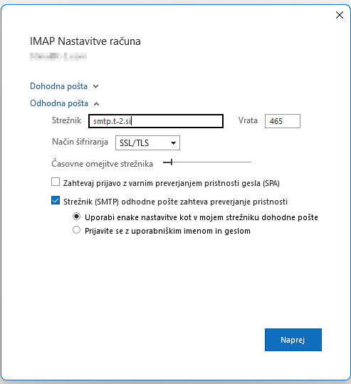 V primeru starejših različic programa Outlook odprite "Nastavitve računa" in kliknite na "Spremeni ..." ter v novem oknu izberite "Več nastavitev". V zavihku "Strežnik za odhodno pošto" izberite možnost "Uporabi enake nastavitve, kot jih ima strežnik za dohodno pošto".