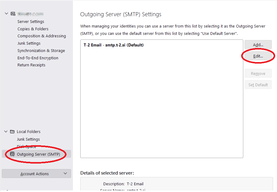 V odjemalcu Mozilla Thunderbird odprite nastavitve (Settings), izberite "Outgoing Server (SMTP) in stisnite gumb "Edit...".