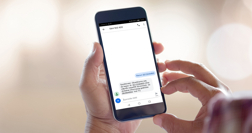 SMS RAČUN: Pošljite SMS s ključno besedo RACUN_ŠTEVILKA_KUPCA na številko 064 100 100 (številko kupca boste našli na kateremkoli izdanem računu).