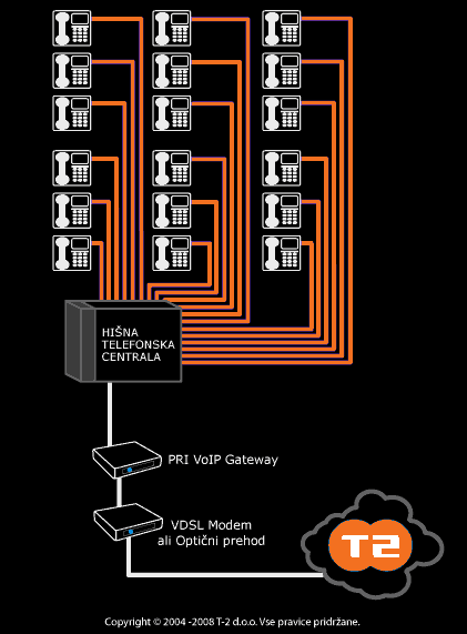 Na sliki: shema priključitve hišne centrale v telefonski sistem T-2 preko PRI vmesnika. PRI vmesnik omogoča do 120 sočasnih govornih kanalov.
