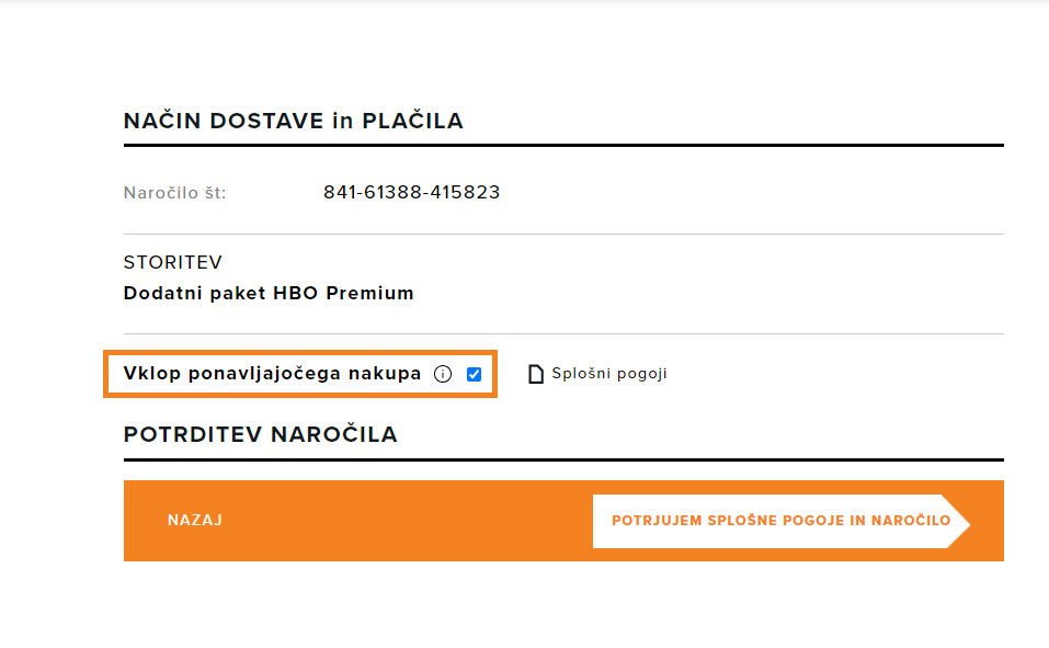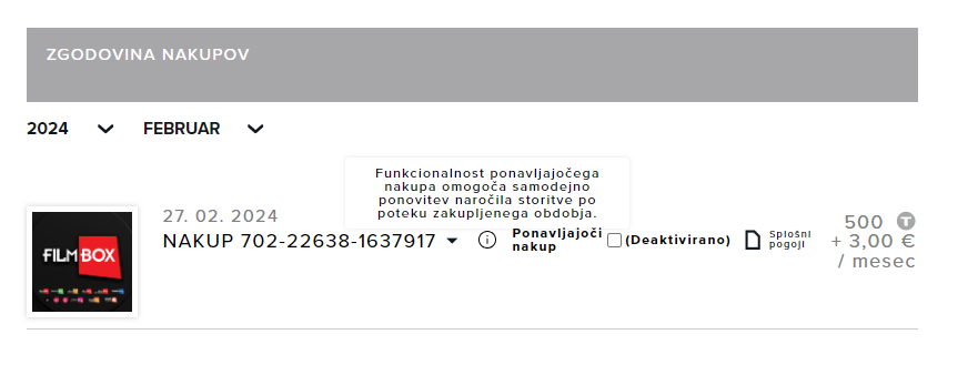 Če imate izbrano storitev že naročeno, lahko funkcijo ponavljajoči nakup aktivirate v svojem profilu Moj Klub, v razdelku zgodovina nakupov. Tukaj lahko funkcijo ponavljajoči nakup tudi izklopite.