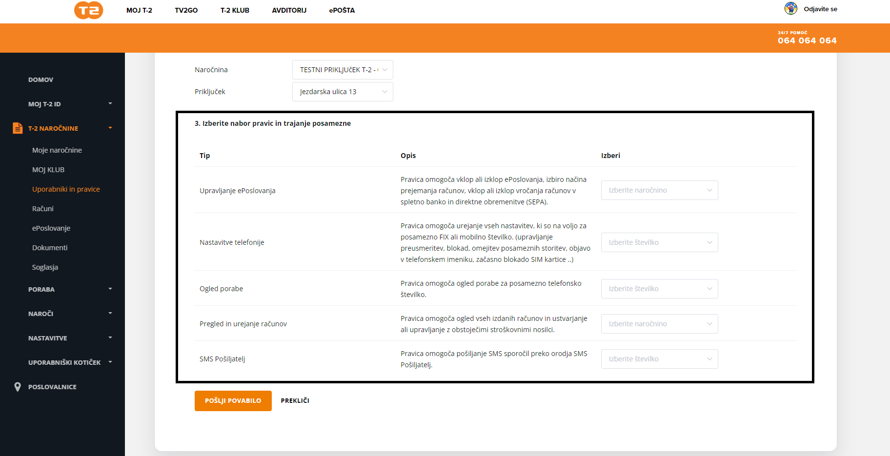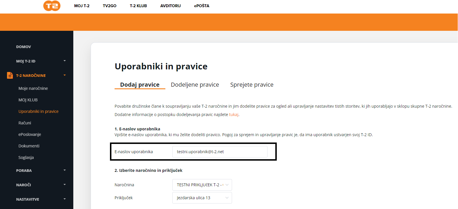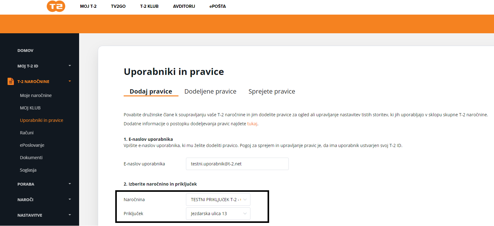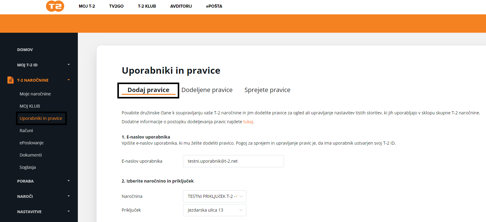 Pogoj za dodelitev posamezne pravice je, da ima uporabnik, ki mu boste dodelili pravico, ustvarjeno svojo T-2 identiteto.
