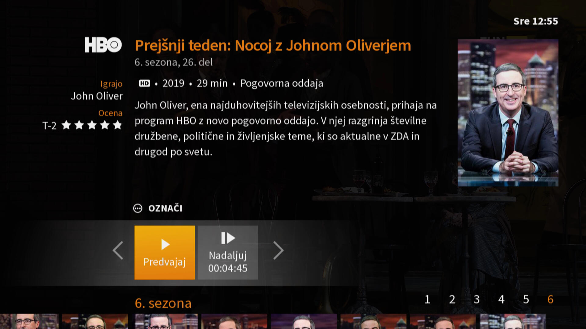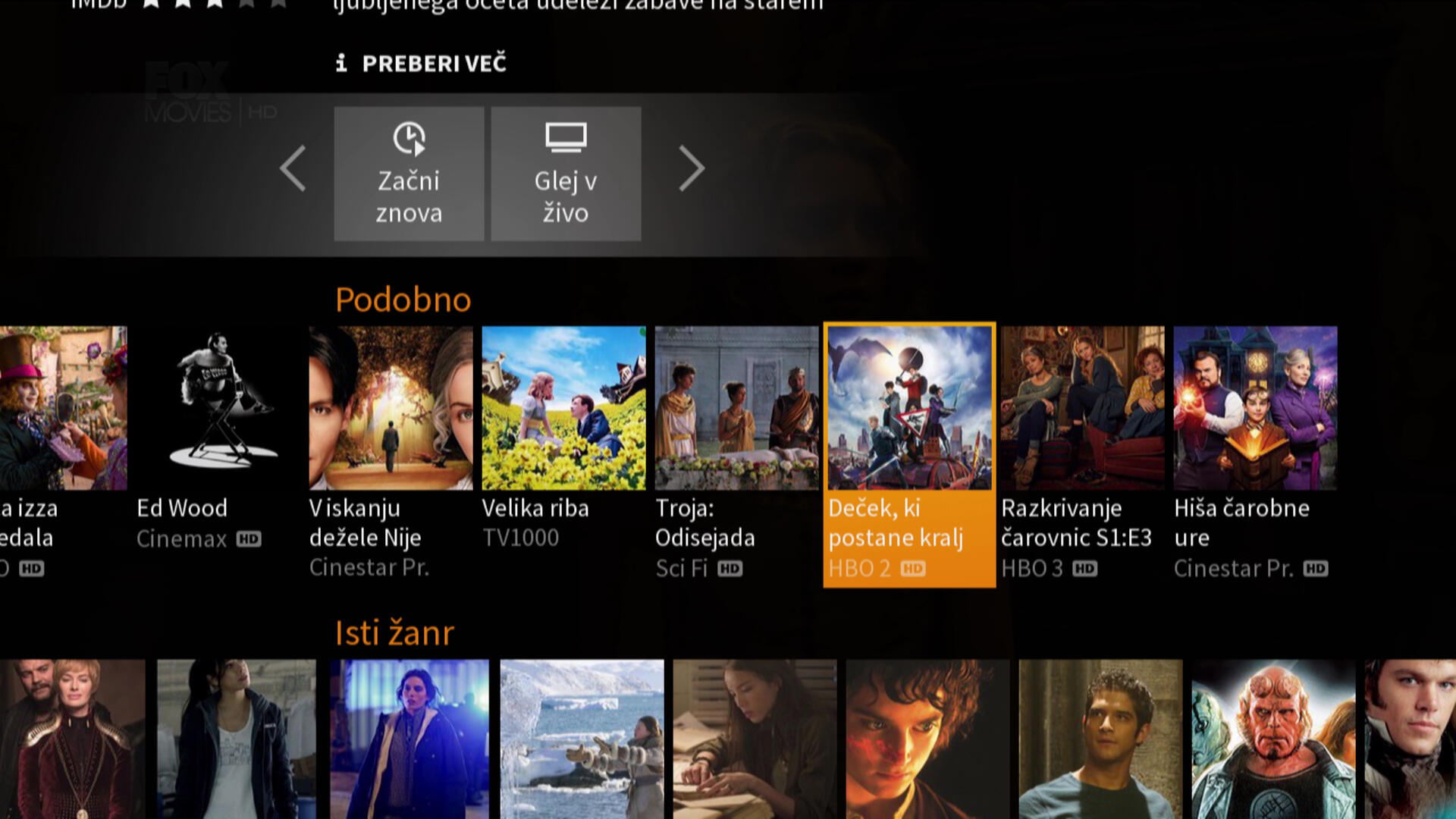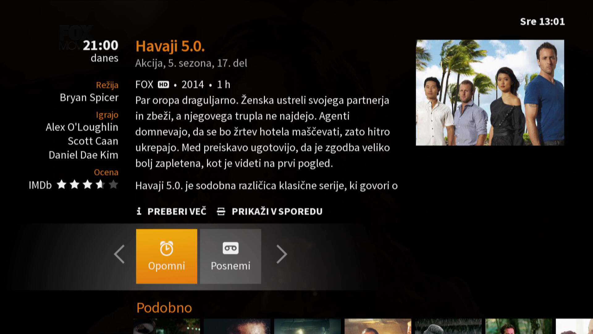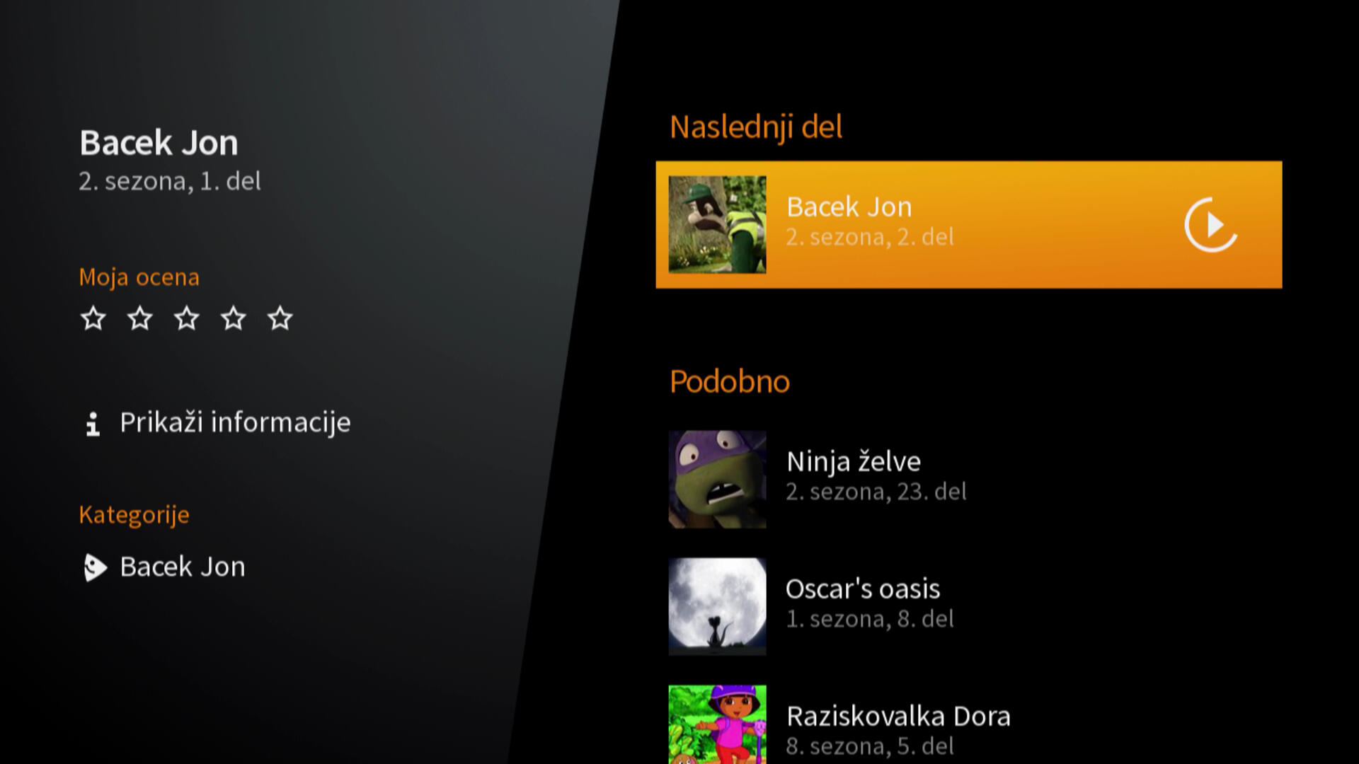 Za vsako izbrano TV vsebino boste s klikom na tipko INFO našli sezono in del izbrane TV vsebine, IMDb oceno in informacijo o predvajani vsebini. S pomikom nižje po zaslonu vas bodo čakale tudi podobne vsebine in vsebine istega žanra.