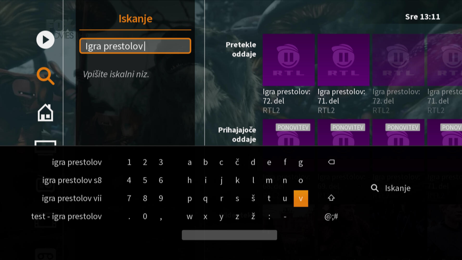 Vse TV vsebine lahko hitro in enostavno poiščete v iskalniku. Vpiši želeno TV vsebino v slovenskem ali angleškem jeziku. Za lažje iskanje lahko v nastavitvah vklopiš tudi virtualno tipkovnico ali uporabite številčnico na daljinskem upravljalniku.