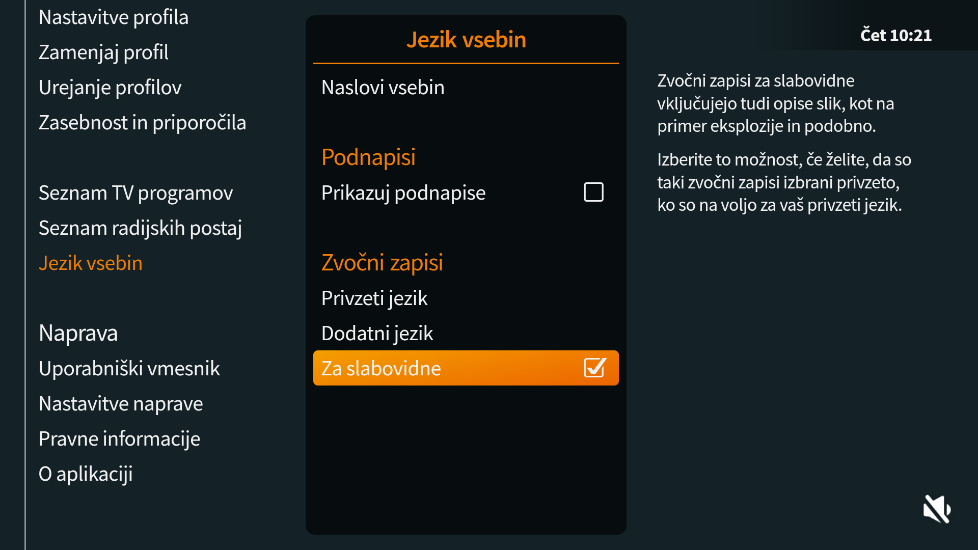 • Zvočni podnapisi: Omogočajo sledenje tujejezičnim vsebinam osebam, ki ne morejo brati klasičnih podnapisov. Namenjeni so slepim, slabovidnim in drugim uporabnikom z oviranim branjem.
